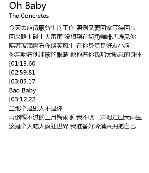 | [03:27.71][03:05.17][02:26.20][01:32.22] | nǐ zěn me kě yǐ bèi pàn de rú cǐ qīng yì Oh Bad Baby |