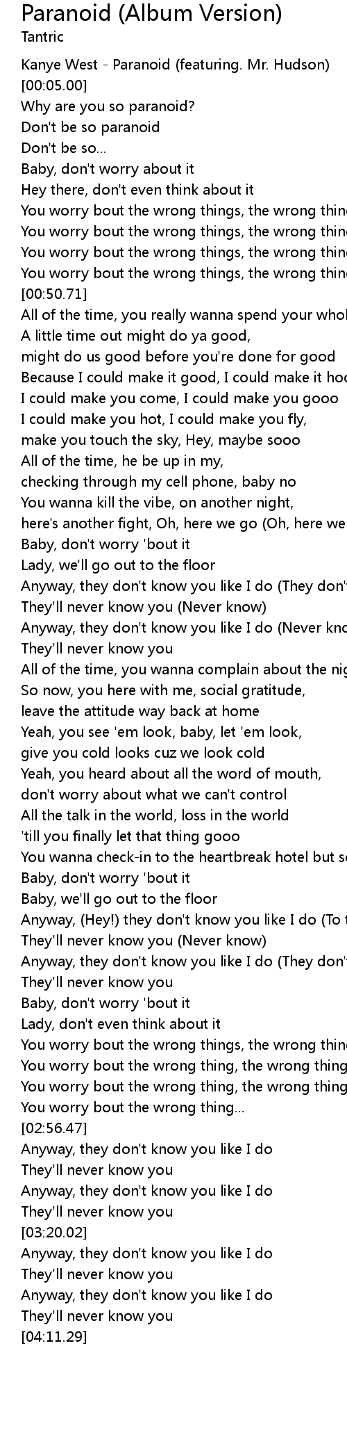 | [00:01.00] | Kanye West - Paranoid (featuring. Mr. Hudson) |