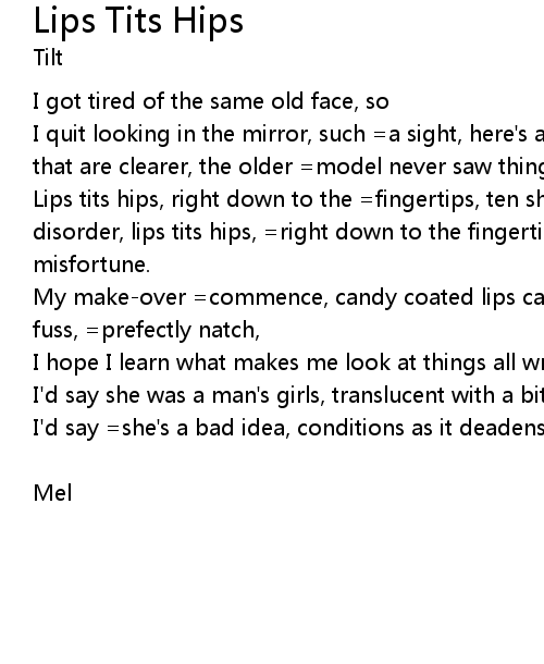 Lips tits hips, right down to the =fingertips, ten shades of beautiful for every disorder, lips tits hips, =right down to the fingertips, just a hint of my misfortune. |