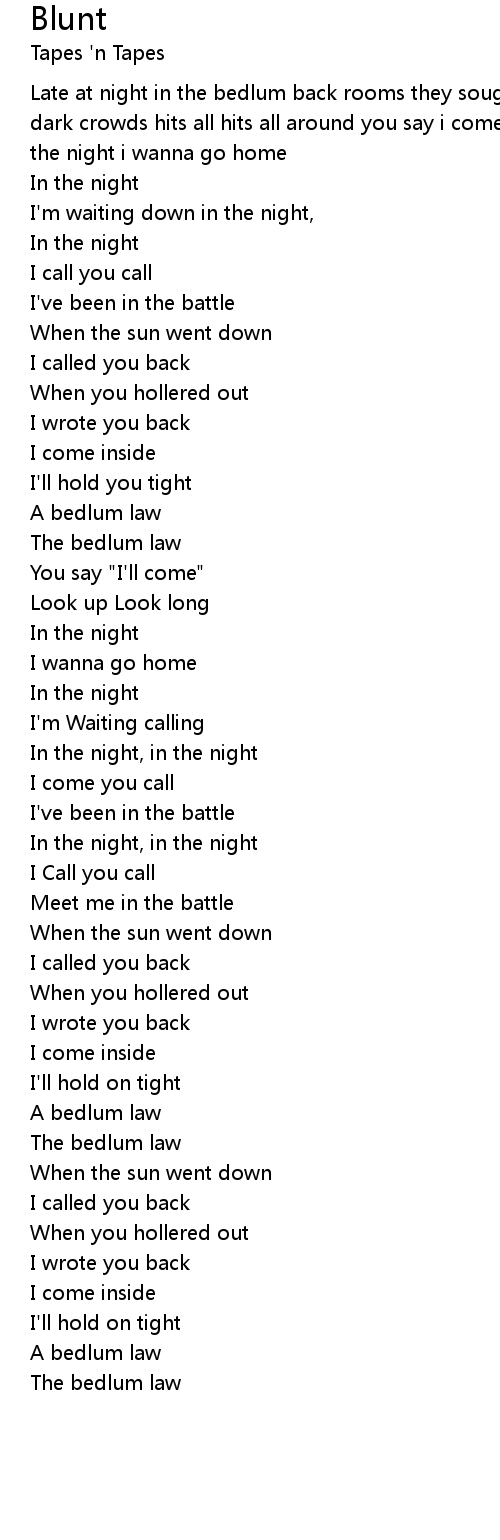 Late at night in the bedlum back rooms they sought you out breakers come in the dark crowds hits all hits all around you say i come look down you're wrong in the night i wanna go home |