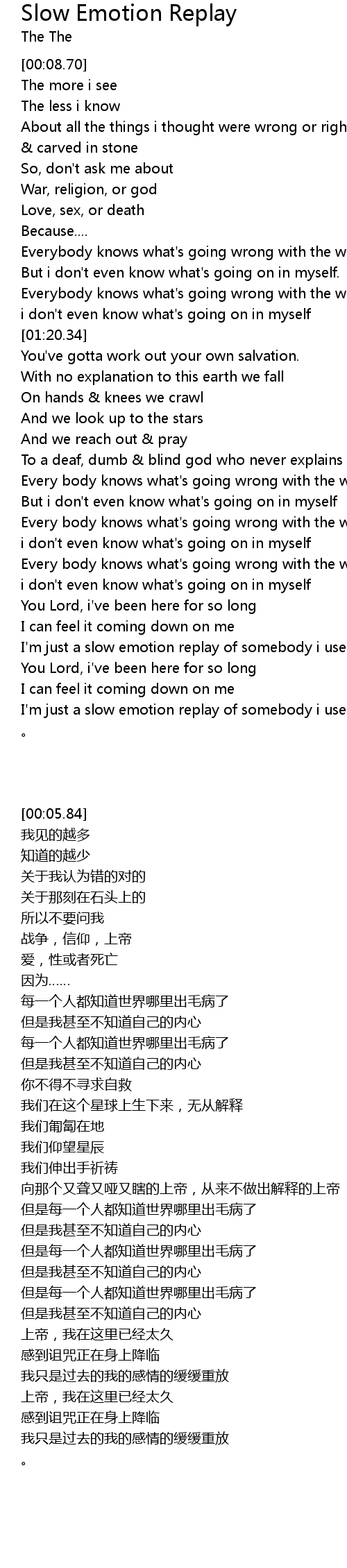 | [03:02.81] | I'm just a slow emotion replay of somebody i used to be |
