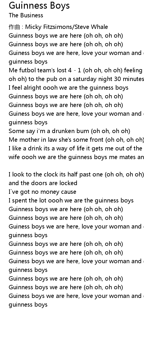 | I like a drink its a way of life it gets me out of the house and away from the wife oooh we are the guinness boys me mates and me are having fun (oh oh, oh oh) | |