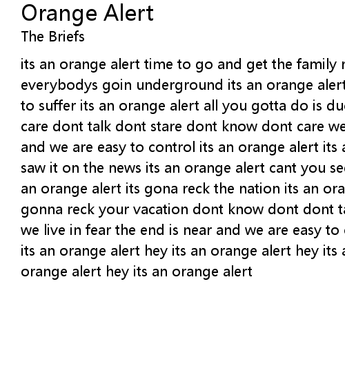 its an orange alert time to go and get the family round its an orange alert everybodys goin underground its an orange alert we might be lost but no one has to suffer its an orange alert all you gotta do is duck and cover dont know dont care dont talk dont stare dont know dont care we live in fear the end is near and we are easy to control its an orange alert its and orange alert just today i saw it on the news its an orange alert cant you see its givin me the blues its an orange alert its gona reck the nation its an orange alert dont you know its gonna reck your vacation dont know dont dont talk dont stare dont know dont care we live in fear the end is near and we are easy to control its an orange alert its an orange alert hey its an orange alert hey its an orange alert hey its an orange alert hey its an orange alert |