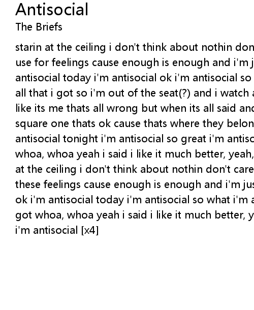 starin at the ceiling i don't think about nothin don't care about you i got no use for feelings cause enough is enough and i'm just about through i'm antisocial today i'm antisocial ok i'm antisocial so what i'm antisocial it's all that i got so i'm out of the seat(?) and i watch all the creeps look at me like its me thats all wrong but when its all said and done theyre only stuck at square one thats ok cause thats where they belong i'm antisocial alright i'm antisocial tonight i'm antisocial so great i'm antisocial it's you that i hate whoa, whoa yeah i said i like it much better, yeah, when your not there starin at the ceiling i don't think about nothin don't care about you im tired of all these feelings cause enough is enough and i'm just about through i'm antisocial ok i'm antisocial today i'm antisocial so what i'm antisocial it's all that i got whoa, whoa yeah i said i like it much better, yeah, when you're not there i'm antisocial [x4] |