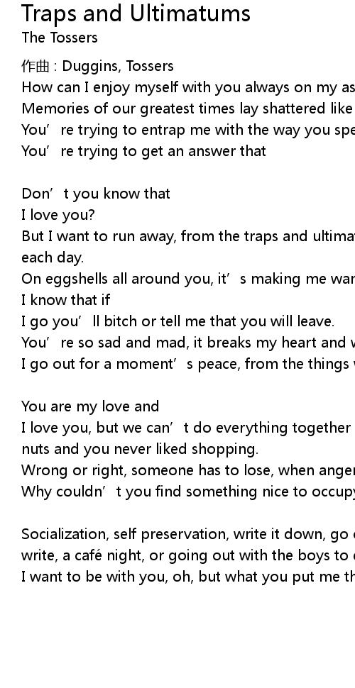 | But I want to run away, from the traps and ultimatums, that you’re giving me each day. | |