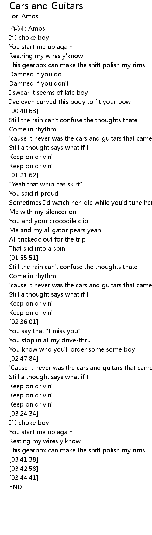 | [01:36.12] | Sometimes I'd watch her idle while you'd tune her up |