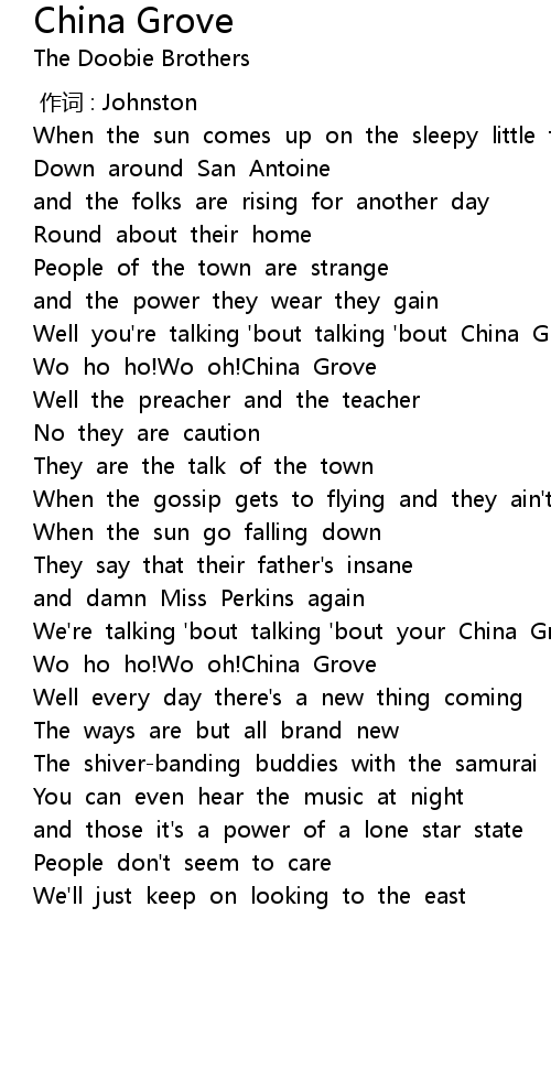 | [00:48.974] | Well you' re talking ' bout talking ' bout China Grove |