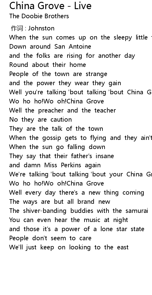 | [00:48.974] | Well you' re talking ' bout talking ' bout China Grove |