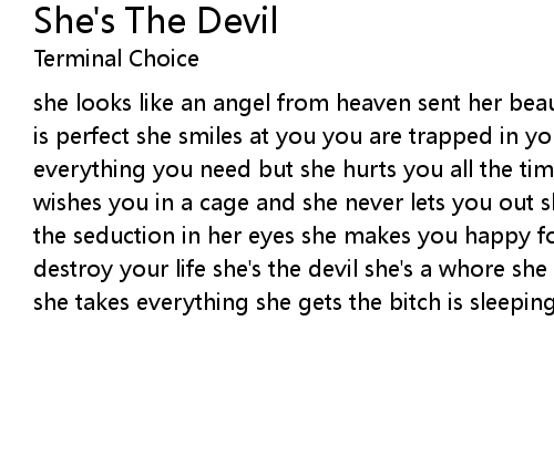 she looks like an angel from heaven sent her beauty paralyzed your mind her body is perfect she smiles at you you are trapped in your own dream she gives you everything you need but she hurts you all the time she tortures your soul she wishes you in a cage and she never lets you out she's the devil in disguise see the seduction in her eyes she makes you happy for this night but she will destroy your life she's the devil she's a whore she doesn't care about your soul she takes everything she gets the bitch is sleeping in your bed |