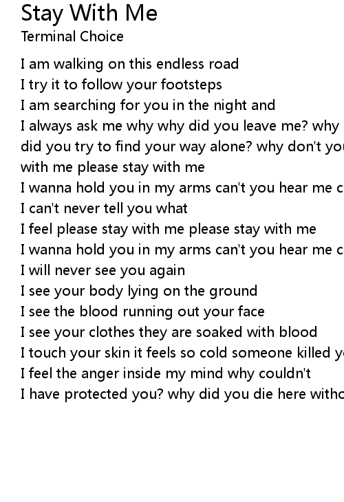 I always ask me why why did you leave me? why did you say no silent words? why did you try to find your way alone? why don't you leave me anymore? please stay with me please stay with me |