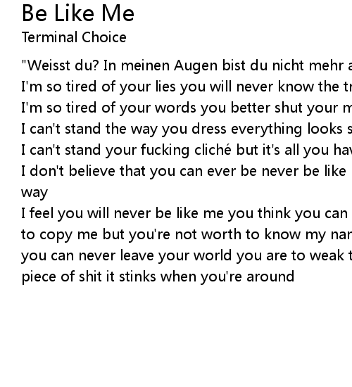 | I feel you will never be like me you think you can take me as your idol you try to copy me but you' re not worth to know my name you' re one of a million assholes you can never leave your world you are to weak to fight you' ll ever be this piece of shit it stinks when you' re around |
