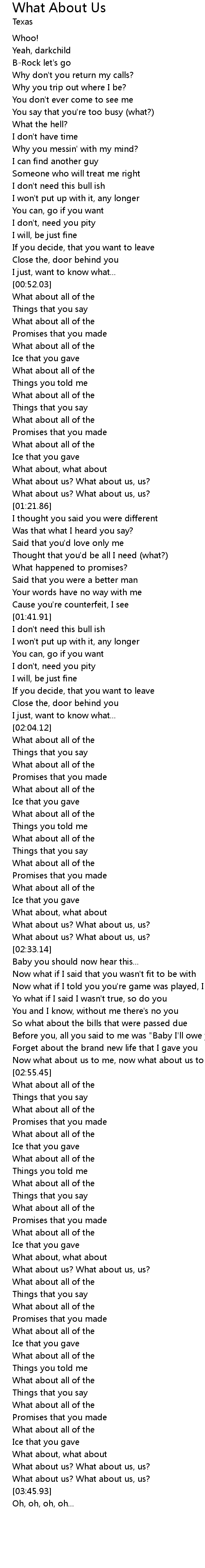 | [02:52.91] | Now what about us to me, now what about us to me |