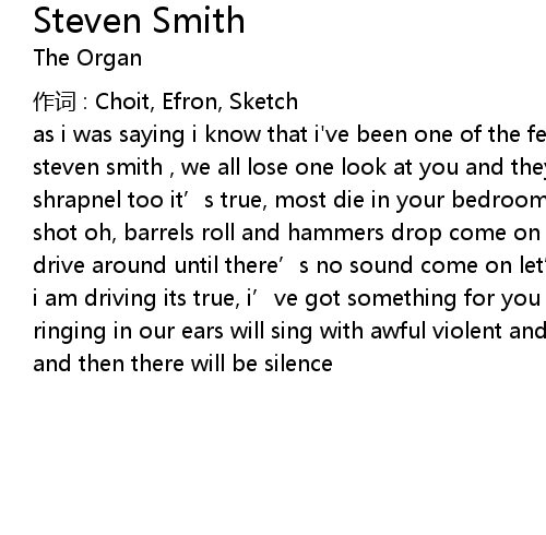 | as i was saying i know that i' ve been one of the few who walks away from you steven smith , we all lose one look at you and they' re suddenly covered in shrapnel too it' s true, most die in your bedroom all the time i' m getting shot oh, barrels roll and hammers drop come on now grab that gun and we' ll go drive around until there' s no sound come on let' s go i said i am driving and i am driving its true, i' ve got something for you when everything is quiet the ringing in our ears will sing with awful violent and then there will be silence and then there will be silence |