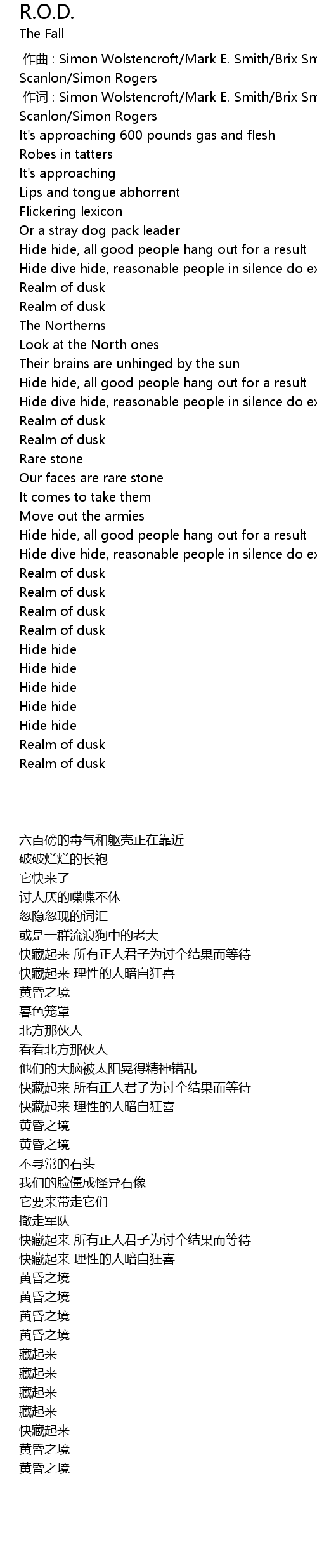| [00:00.00] | zuò qǔ : Simon Wolstencroft Mark E. Smith Brix Smith Craig Scanlon Simon Rogers |