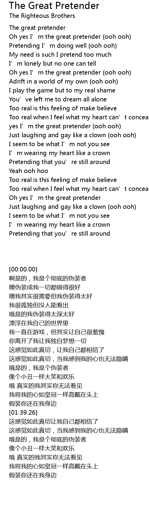| [00:01.47] | Oh yes I’m the great pretender (ooh ooh) |