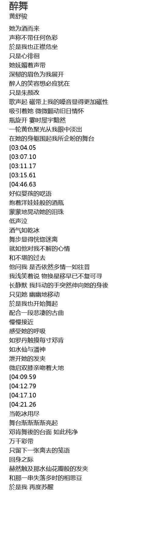 | [03:19.65][03:04.05][01:29.23][01:13.17] | 她跳着醉舞 |