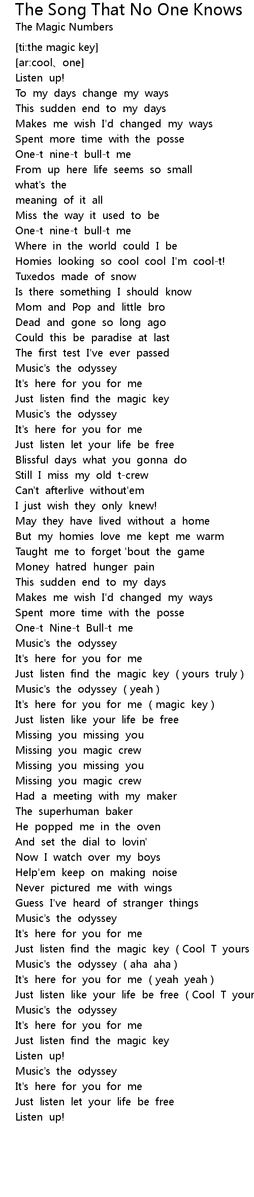 | [01:48.814] | Just listen find the magic key (yours truly) |