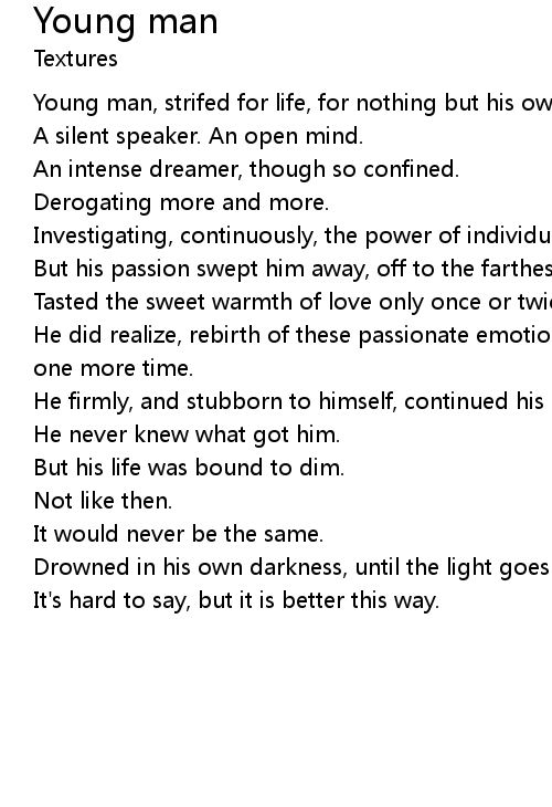 | Young man, strifed for life, for nothing but his own. | |
