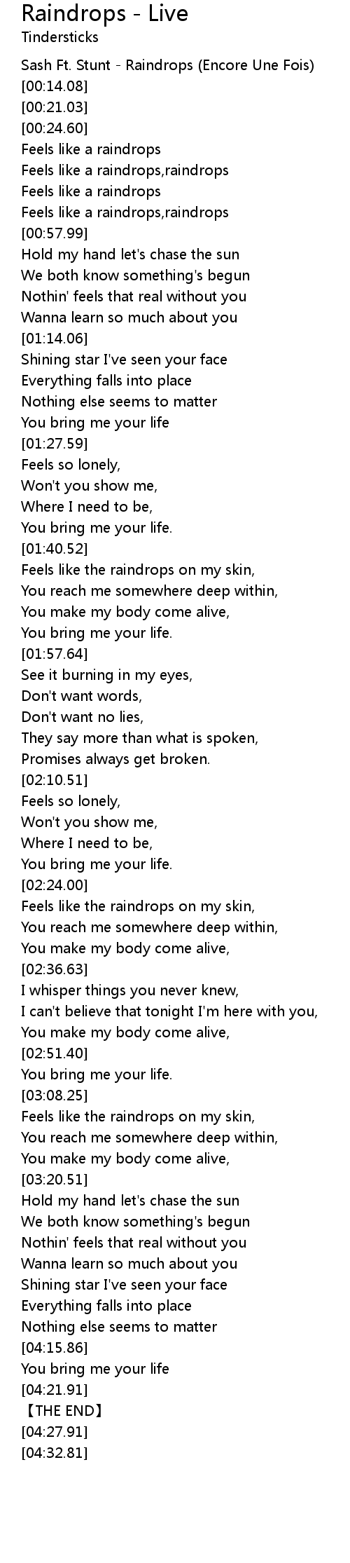 | [00:43.11] | Feels like a raindrops |