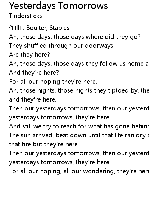 | Then our yesterdays tomorrows, then our yesterdays tomorrows, then our yesterdays tomorrows, they're here. | |
