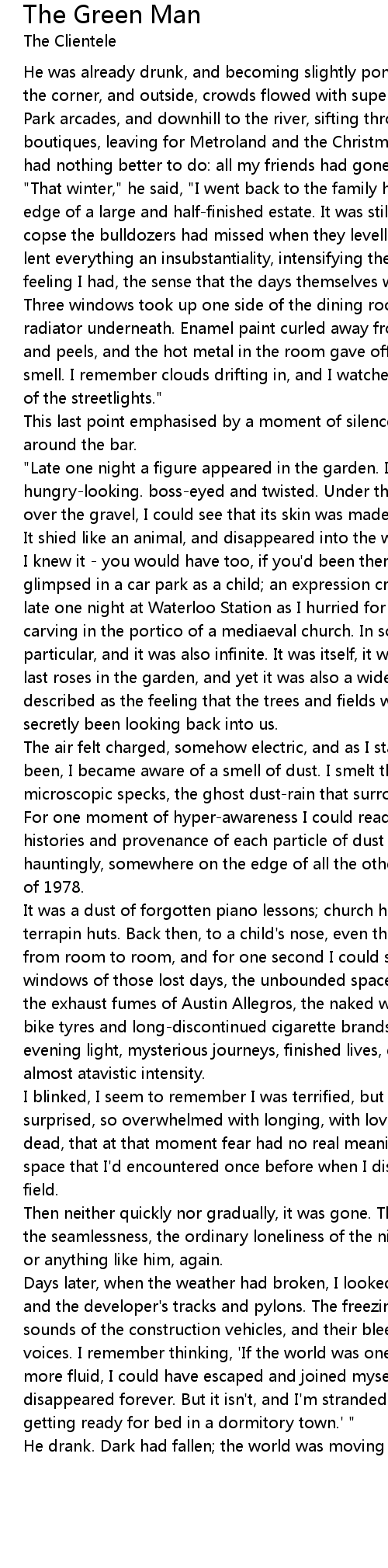 I knew it - you would have too, if you'd been there; it was a figure I'd glimpsed in a car park as a child; an expression crossing the face of a stranger late one night at Waterloo Station as I hurried for a train with my parents; a carving in the portico of a mediaeval church. In some nightmarish way it was particular, and it was also infinite. It was itself, it was the wood, it was the last roses in the garden, and yet it was also a wider sentience, perhaps best described as the feeling that the trees and fields we look at have always secretly been looking back into us. |