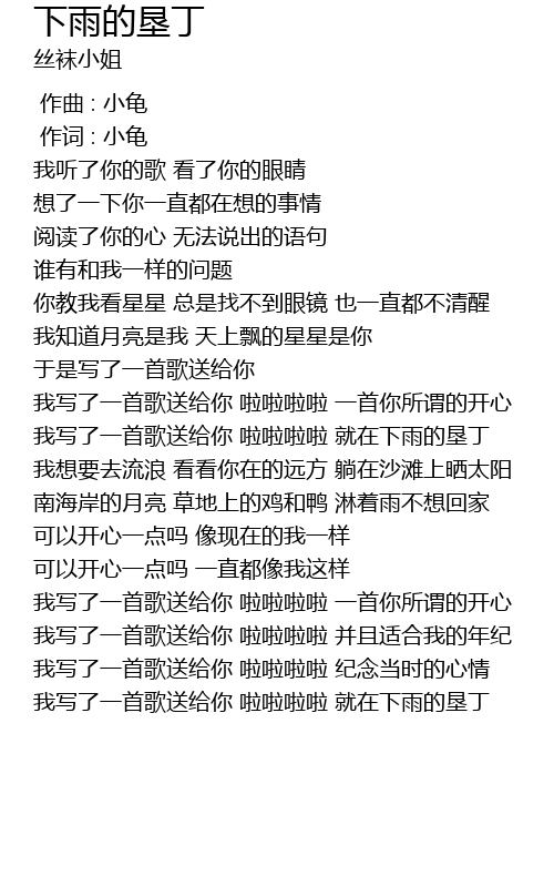 | [02:48.160] | 我写了一首歌送给你 啦啦啦啦 就在下雨的垦丁 |