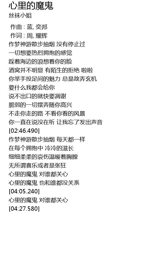 | [04:06.450] | 心里的魔鬼 对谁都关心 |