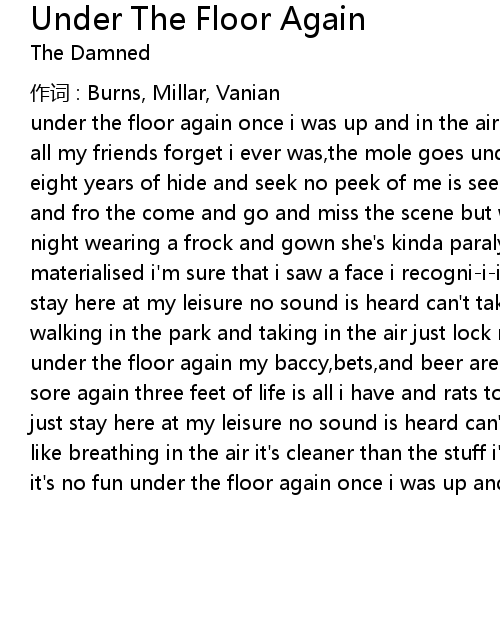 | under the floor again once i was up and in the air but now i' m down goodbye to all my friends forget i ever was, the mole goes underground under the floor again eight years of hide and seek no peek of me is seen i skip the law again the to and fro the come and go and miss the scene but who was the girl we saw last night wearing a frock and gown she' s kinda paralysed a door in the flor a head materialised i' m sure that i saw a face i recogniiiised don' t say a word just stay here at my leisure no sound is heard can' t take my simple pleasures like walking in the park and taking in the air just lock me in the dark it' s no fun under the floor again my baccy, bets, and beer are here and all i need i' m feeling sore again three feet of life is all i have and rats to feed won' t say a word just stay here at my leisure no sound is heard can' t take my simple pleasures like breathing in the air it' s cleaner than the stuff i' ve had in recent months it' s no fun under the floor again once i was up and in the air but now i' m down |