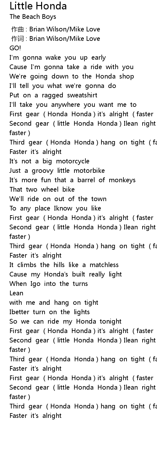 | [00:22.64] | First gear Honda Honda it' s alright faster faster |