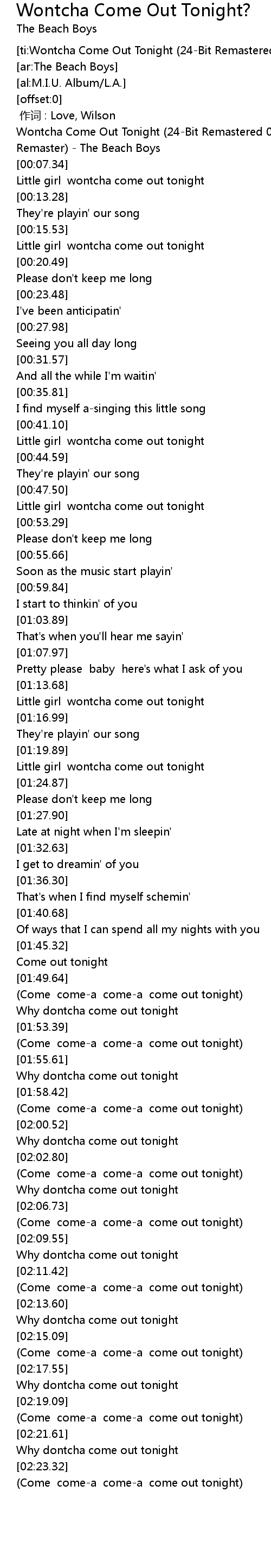 | [00:01.15] | Wontcha Come Out Tonight (24-Bit Remastered 00) (2000 Digital Remaster) - The Beach Boys |