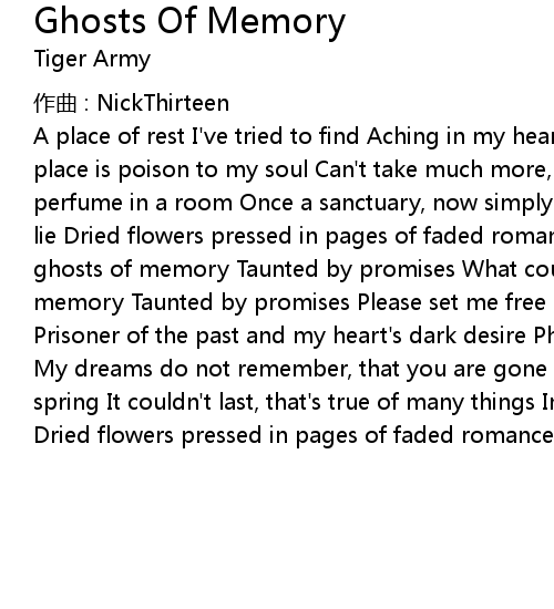 | A place of rest I' ve tried to find Aching in my heart, chaos in my mind This place is poison to my soul Can' t take much more, I' m losing control Faded perfume in a room Once a sanctuary, now simply a tomb And it is in this tomb I lie Dried flowers pressed in pages of faded romance died And I' m haunted by ghosts of memory Taunted by promises What could have been? Haunted, by ghosts of memory Taunted by promises Please set me free Roses blooming in hellfire Prisoner of the past and my heart' s dark desire Phantom love that still holds on My dreams do not remember, that you are gone Just like the melting snow in spring It couldn' t last, that' s true of many things In the emerald sea I' ll lie Dried flowers pressed in pages of faded romance died |