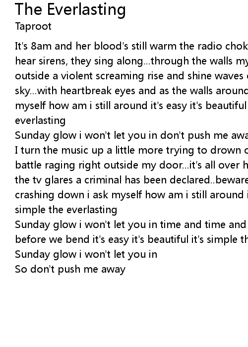 I turn the music up a little more trying to drown out what's in store there's a battle raging right outside my door...it's all over head downstairs empty table the tv glares a criminal has been declared..beware and as the walls around come crashing down i ask myself how am i still around it's easy it's beautiful it's simple the everlasting |