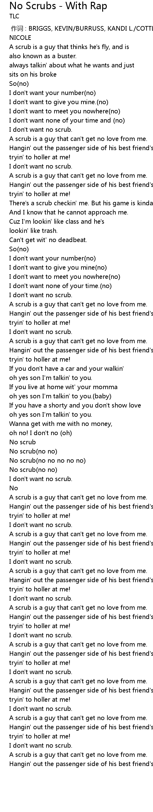 | [03:17.00] | A scrub is a guy that can't get no love from me. |