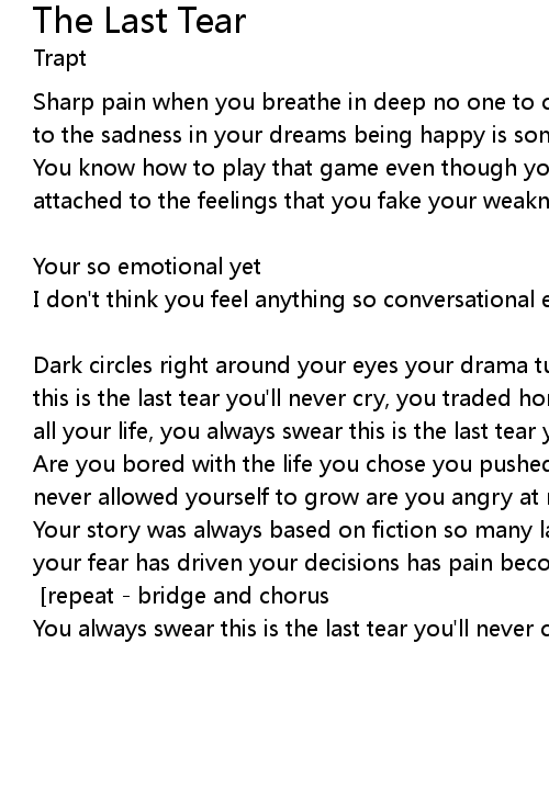 Dark circles right around your eyes your drama turns into sigh, you always swear this is the last tear you'll never cry, you traded honesty for lies you faked it all your life, you always swear this is the last tear you'll never cry |
