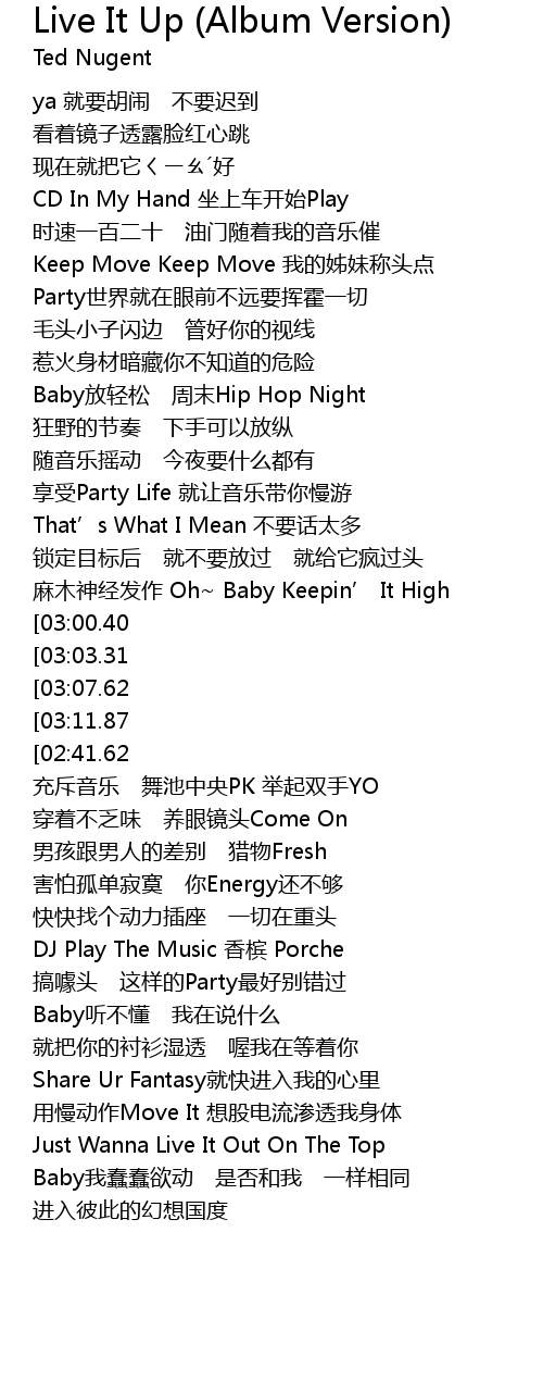 | [03:22.79][03:03.31][02:28.59][01:17.14] | Live It Up 看你Show Ur Body 惹火 |
