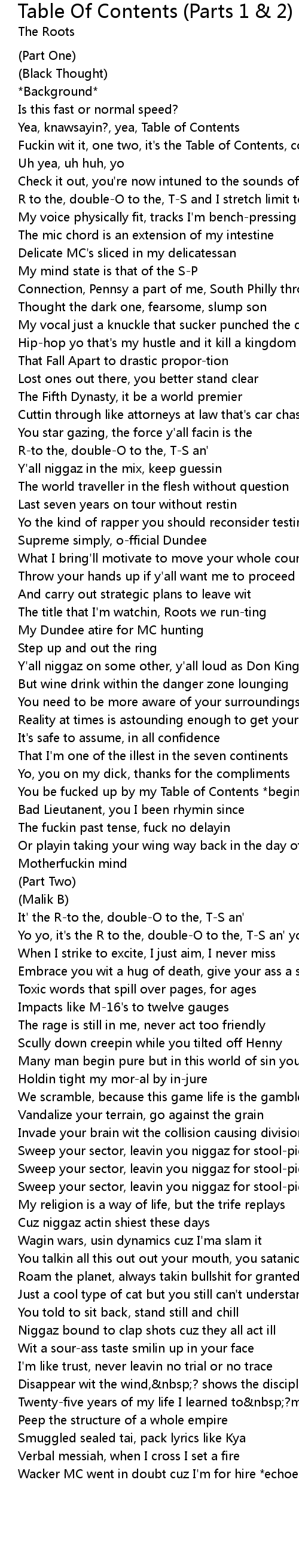 Fuckin wit it, one two, it's the Table of Contents, come on (2x) |