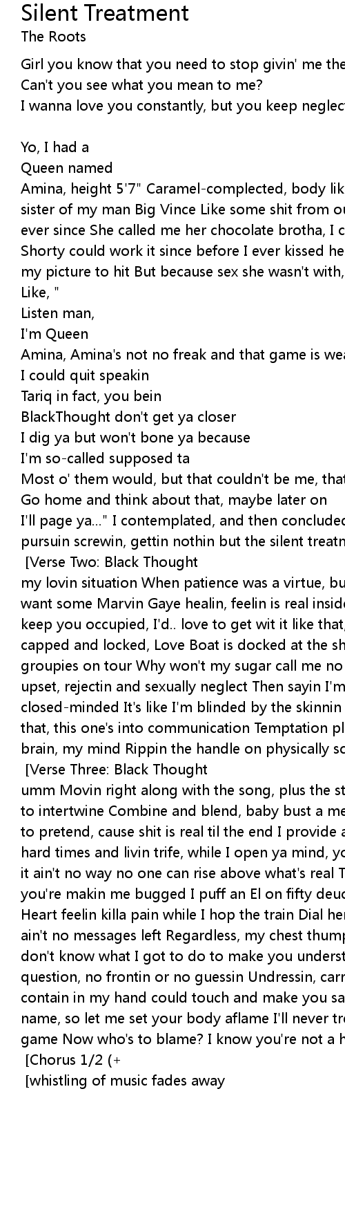 Silently bay-bee" at end)] [Verse Two: Black Thought] Crazy frustration, about my lovin situation When patience was a virtue, but I wasn't used to waitin I want some Marvin Gaye healin, feelin is real inside I slip and slide, my ride'll keep you occupied, I'd.. love to get wit it like that, but my baby's kitty cat's capped and locked, Love Boat is docked at the shore And what for? Later for groupies on tour Why won't my sugar call me no more? I mean, my Queen gets upset, rejectin and sexually neglect Then sayin I'm more sewer than Das EFX, and closed-minded It's like I'm blinded by the skinnin I'm into women; because of that, this one's into communication Temptation played the vandal, freakin my brain, my mind Rippin the handle on physically scandalous acts Yo! She knew what I wanted, but she fronted ... bust it [Chorus] [Verse Three: Black Thought] Well umm Movin right along with the song, plus the strong feelings on my mind, desire to intertwine Combine and blend, baby bust a message that I send Ain't no need to pretend, cause shit is real til the end I provide a place to hide from crime, hard times and livin trife, while I open ya mind, you're in my life like love, it ain't no way no one can rise above what's real That's why I'm feelin like you're makin me bugged I puff an El on fifty deuce while I walk in the rain Heart feelin killa pain while I hop the train Dial her number to the rest, and ain't no messages left Regardless, my chest thumps from stress, yo it's a mess I don't know what I got to do to make you understand I'm for real and that's no question, no frontin or no guessin Undressin, carressin, in the span, that I contain in my hand could touch and make you say that I'm such a man and call my name, so let me set your body aflame I'll never treat you like a dame or run game Now who's to blame? I know you're not a hoe for niggaz with a lot of dough But I just wanted you to know [Chorus (+ "silently" at end)] [Chorus 1/2 (+ "silently, si-lent-ly" at end)] [whistling of music fades away] |