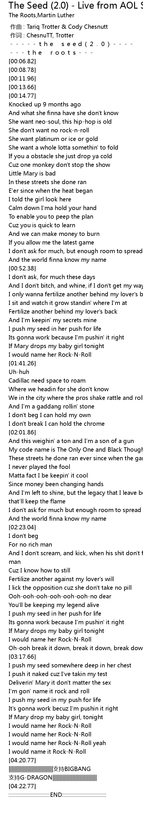 | [02:04.38] | My code name is The Only One and Black Thought is bad |