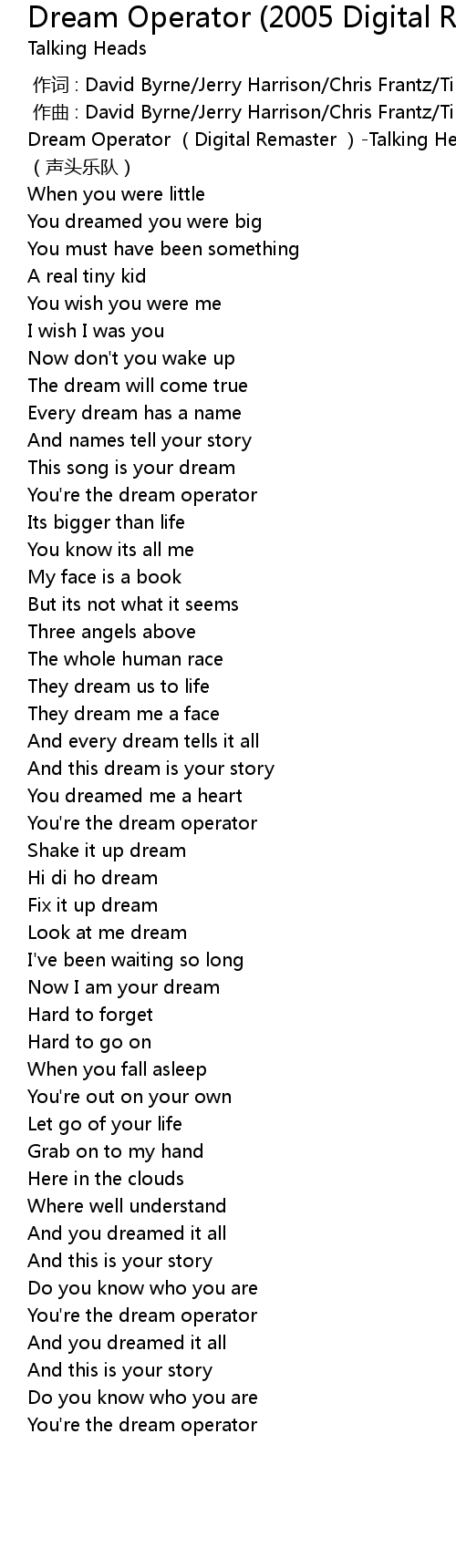 | [00:00.00] | Dream Operator Digital Remaster Talking Heads shēng tóu yuè duì |