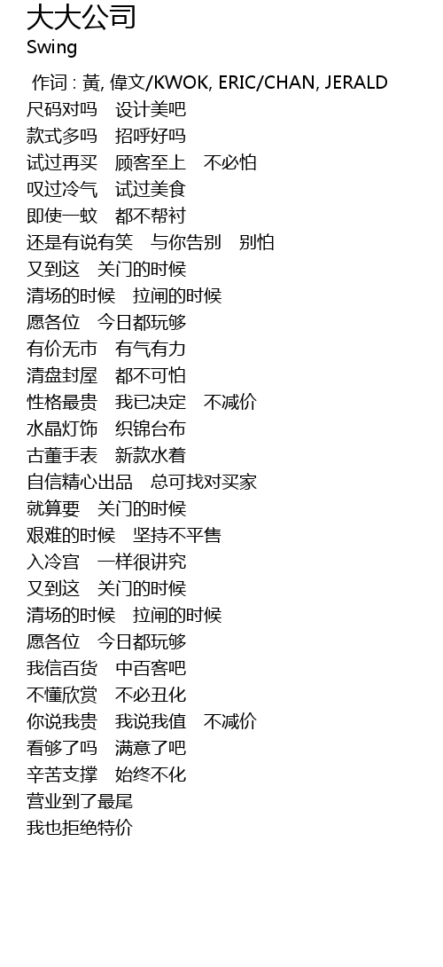 | [00:00.00] | zuo ci : huang, wei wen KWOK, ERIC CHAN, JERALD |