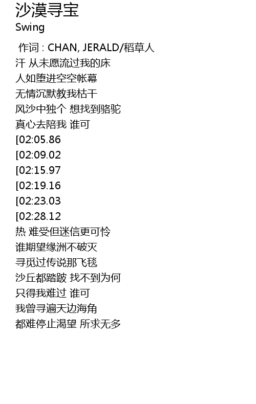 | [00:35.92] | 风沙中独个 想找到骆驼 |