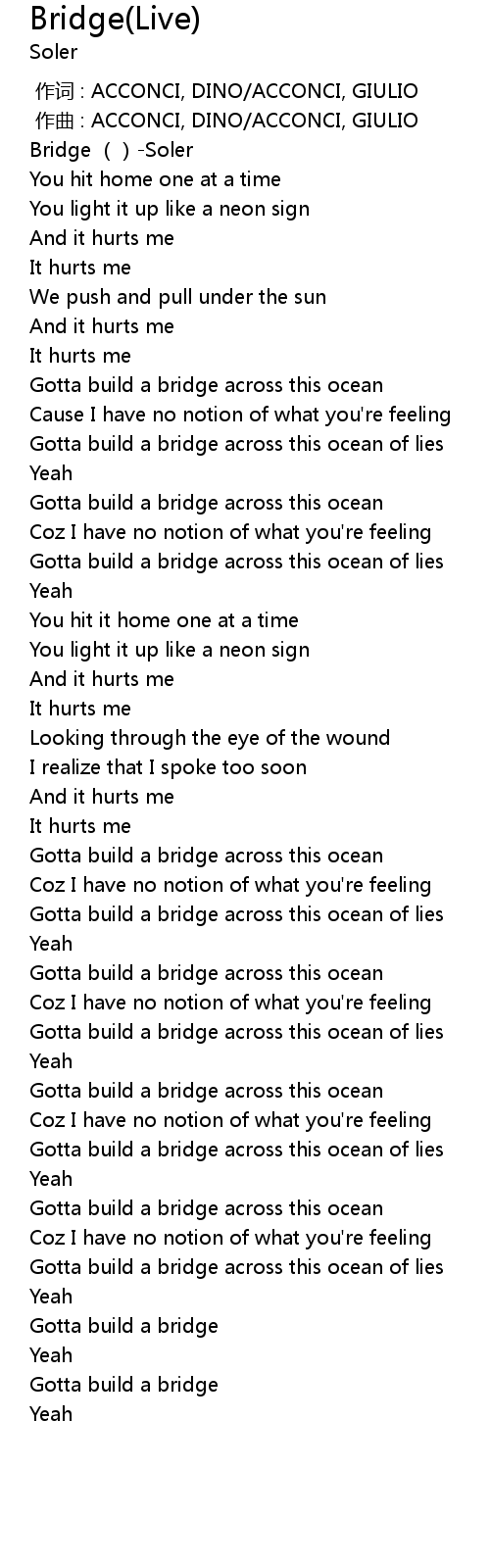 | [02:15.993] | Gotta build a bridge across this ocean of lies |