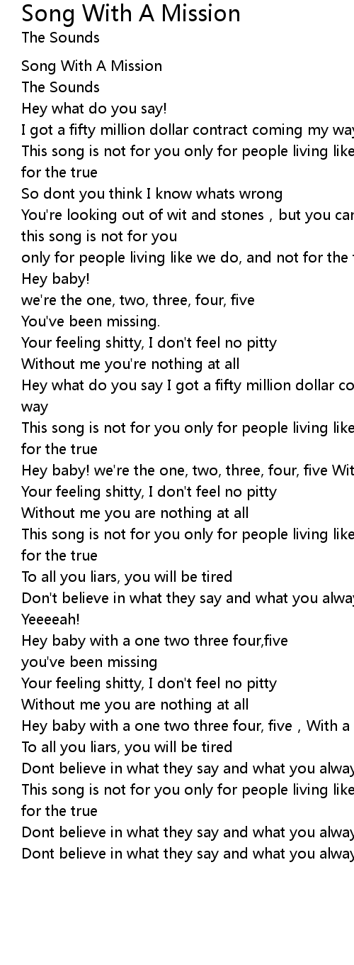 | [02:34.59] | Hey baby with a one two three four, five, With a mission |