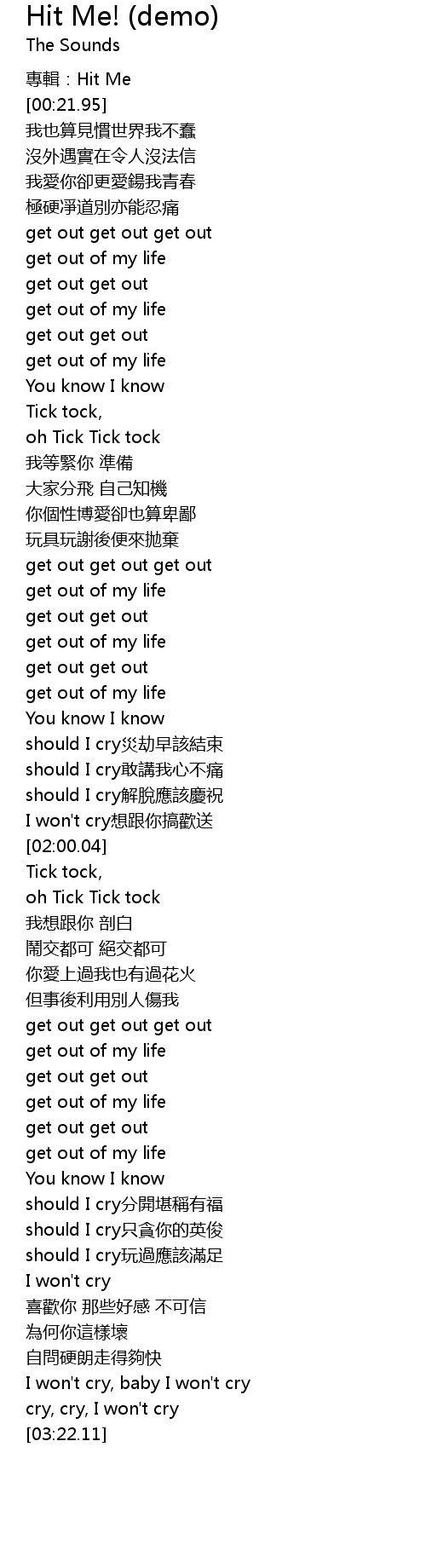 | [03:12.37] | I won' t cry, baby I won' t cry |