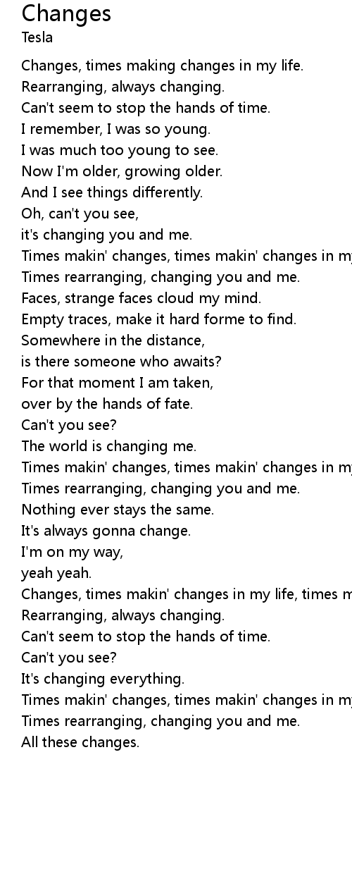 Changes, times makin' changes in my life, times makin' changes in my life. |