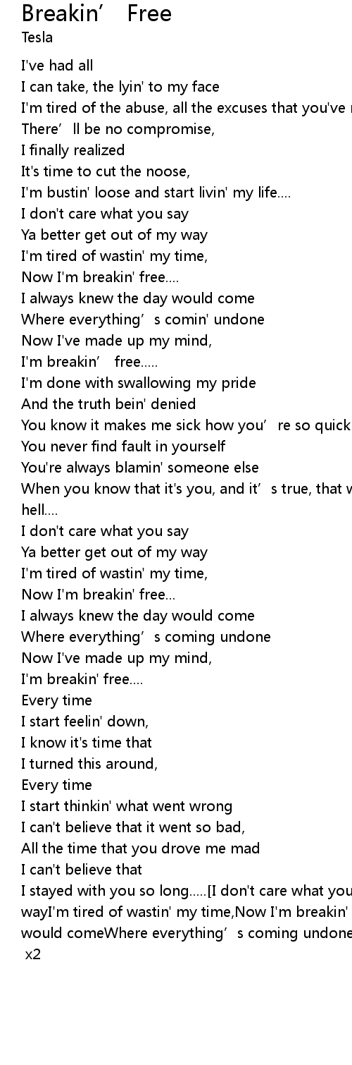 | I stayed with you so long..... I don' t care what you sayYa better get out of my wayI' m tired of wastin' my time, Now I' m breakin' free... I always knew the day would comeWhere everything' s coming undoneNow I' ve made up my mind, I' m breakin' free.... x2 |