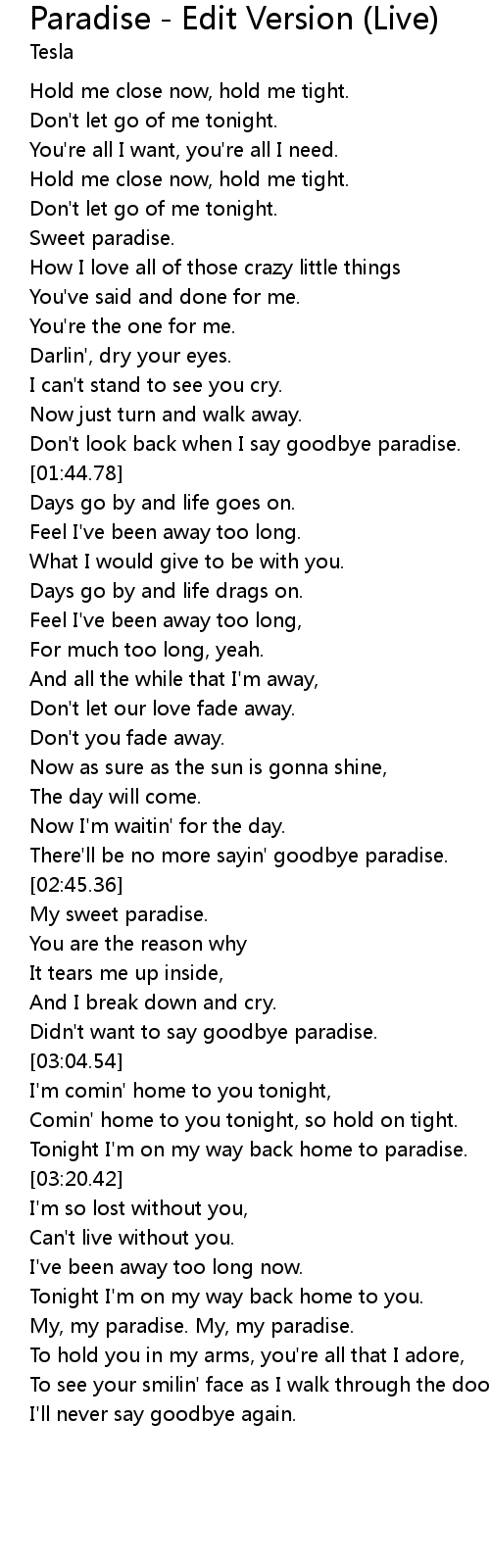 | [02:39.49] | There'll be no more sayin' goodbye paradise. |