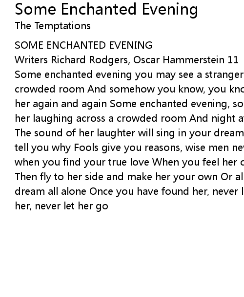 Some enchanted evening you may see a stranger You may see a stranger across a crowded room And somehow you know, you know even then That somewhere you'll see her again and again Some enchanted evening, someone may be laughing You may hear her laughing across a crowded room And night after night, as strange as it seems The sound of her laughter will sing in your dreams Who can explain it, who can tell you why Fools give you reasons, wise men never try Some enchanted evening, when you find your true love When you feel her call you across a crowded room Then fly to her side and make her your own Or all through your life you may dream all alone Once you have found her, never let her go Once you have found her, never let her go |
