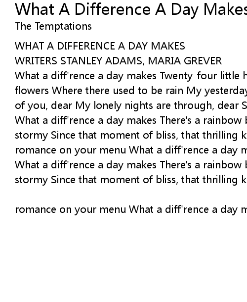 What a diff'rence a day makes Twenty-four little hours Brought the sun and the flowers Where there used to be rain My yesterday was blue, dear Today I'm part of you, dear My lonely nights are through, dear Since you said you were mine What a diff'rence a day makes There's a rainbow before me Skies above can't be stormy Since that moment of bliss, that thrilling kiss It's heaven when you Find romance on your menu What a diff'rence a day makes And the difference is you What a diff'rence a day makes There's a rainbow before me Skies above can't be stormy Since that moment of bliss, that thrilling kiss It's heaven when you Find |