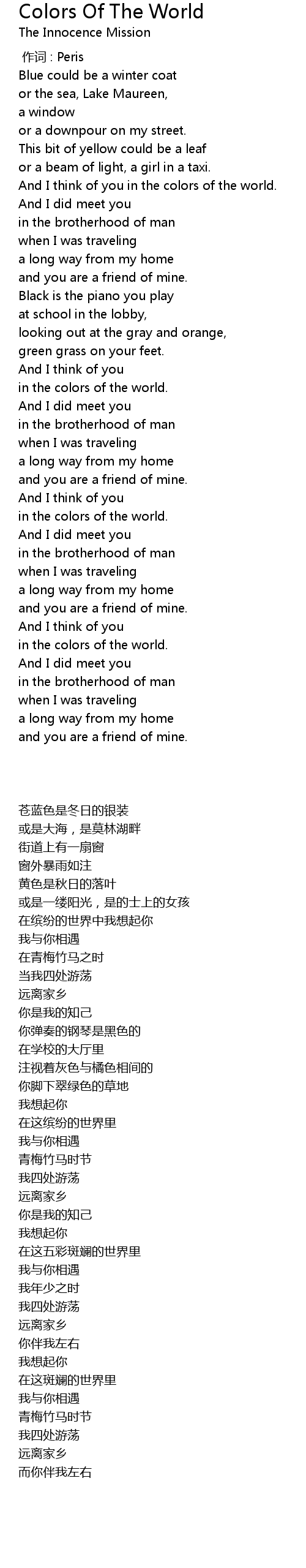 | [00:36.05] | And I think of you in the colors of the world. |